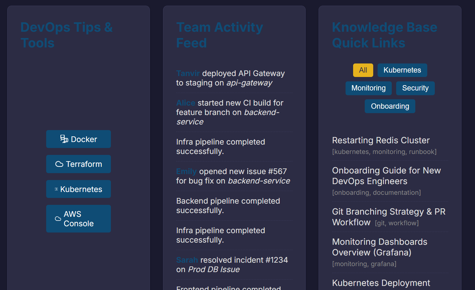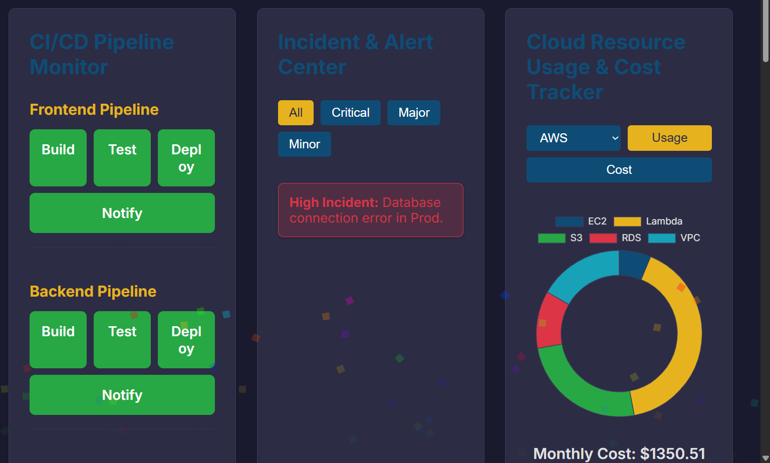 It mimics a live internal intranet dashboard used by DevOps and cloud teams to monitor CI/CD pipelines, track incidents, visualize cloud costs, observe deployment schedules, and more — without relying on any backend or API.