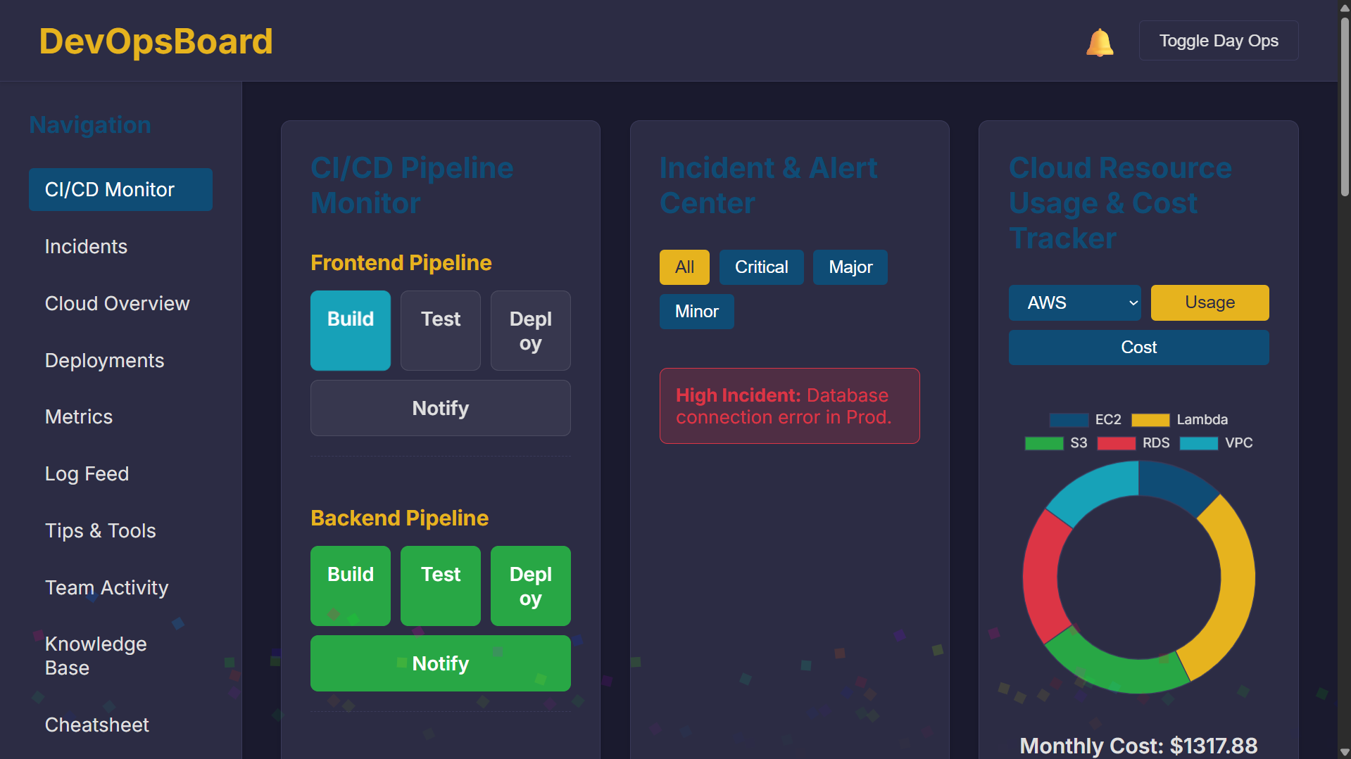 DevOpsBoard is a fully frontend-only, interactive DevOps dashboard — built using only HTML, CSS, and JavaScript — designed to simulate a real-world DevOps/SRE control room.